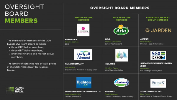The Board comprises a balanced representation of GDT participants including bidders, sellers and financial market members. Oversight Board members meet several times per year to monitor GDT’s compliance with appropriate governance practices and to vote on any proposed changes to the GDT Trading Event Rules.